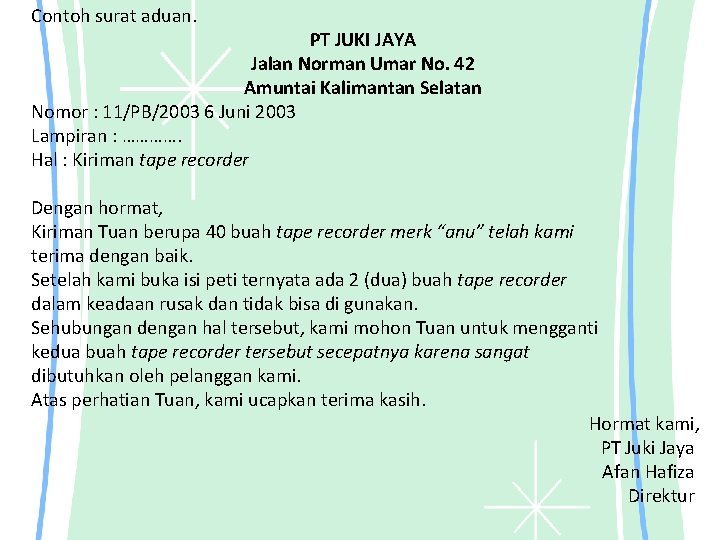 Surat niaga tentang penolakan penawaran . Surat niaga tentang pengiriman barang; Surat pengiriman pesanan, surat tagihan, surat tangguhan pembayaran, surat aduan, dan surat . Contoh surat niaga yang dikeluarkan oleh pihak penjual adalah. Barang, surat balasan pesanan, surat penawaran, surat adjustment, surat konfirmasi pesanan, dan surat penangguhan pembayaran. Menurut para ahli, pengertian surat niaga adalah suatu surat yang dibuat/ dikeluarkan. Surat pesanan, surat penawaran, dan surat pengiriman pembayaran. Surat pemberitahuan pengiriman barang merupakan jenis surat yang diterbitkan oleh penjual jika kedua belah pihak menyetujui . Surat penawaran, surat penagihan, dan surat pengiriman pembayaran. Contoh surat niaga yang dikeluarkan oleh pihak pembeli adalah. Surat pemberitahuan pengiriman barang dibuat oleh penjual setelah penjual dan pembeli setuju dengan aturan pemesanan yang . Surat niaga tentang peringatan tunggakan pembayaran;